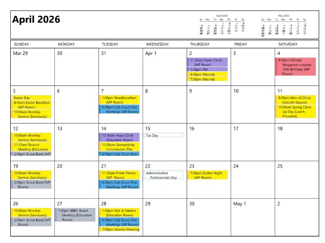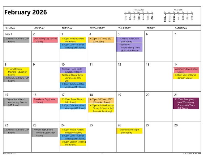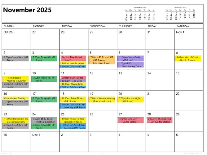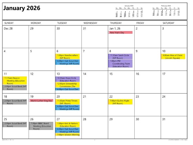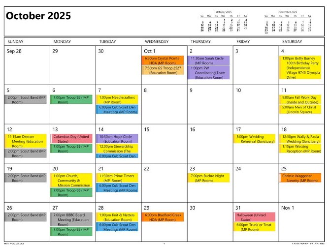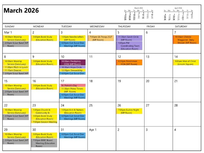 Yellow = Church Activity Purple = Presbyterian Women Activity Gold =Outside Group Green = Boy Scout Troop 88 Activity Blue = Cub Scout Pack 88 Activity Red = Girl Scout Activity Orange = Holiday