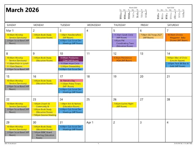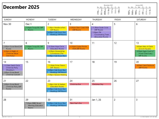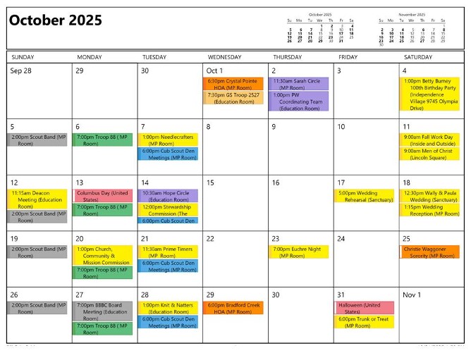 Yellow = Church Activity Purple = Presbyterian Women Activity Gold =Outside Group Green = Boy Scout Troop 88 Activity Blue = Cub Scout Pack 88 Activity Red = Girl Scout Activity Orange = Holiday